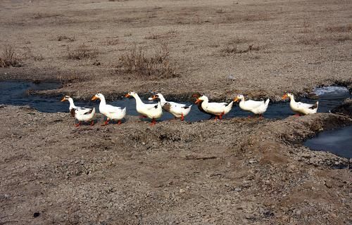 1月27日,几只鸭子在山东枣庄市市中区沧浪河接近干涸的河床上觅食。新华社发(孙中喆 摄)