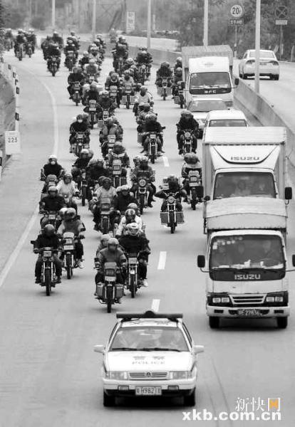 李萍说,由于年前321国道路段全部修好,路好,又没下雨,农民工归家心切,车速快,加上气温较低,容易出现手脚僵硬,不安全因素增多的情况,为确保他们的安全,肇庆交警在该国道安排了多辆警车在上午9时、11时,下午3时和4时车流量较多的时段,轮流护送这支“铁骑大军”至广东边境。