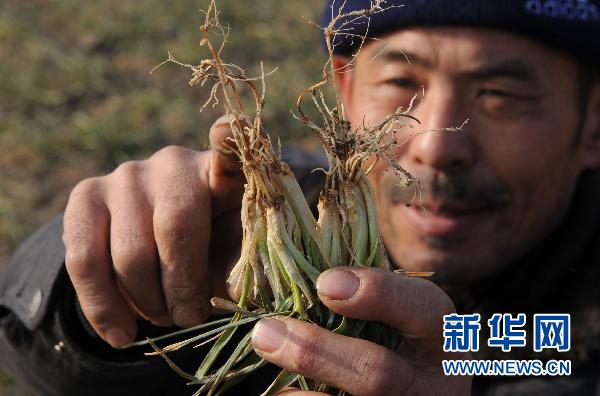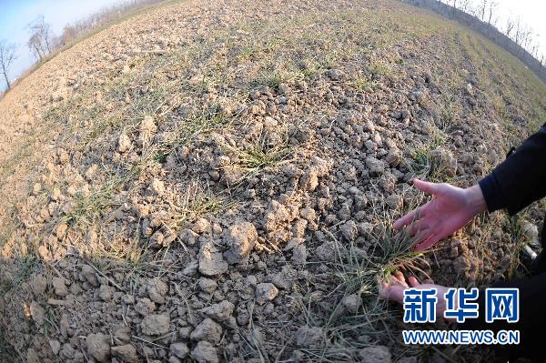 1月27日,安徽省亳州市谯城区张集村村民孙明华在查看麦田里接近干枯的麦苗。最新统计显示,遭遇新中国成立以来最大旱情的安徽省淮北地区目前受旱面积达1124.2万亩。干旱未来几天仍将持续,而低温天气使抗旱浇灌难以进行。安徽省防指有关负责人介绍,自2010年10月份以来,安徽省平均降雨量92毫米,比常年同期偏少4成,其中淮北地区比常年同期偏少9成。 新华社发(张延林 摄)