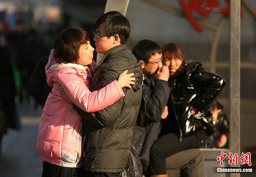 1月31日,两对情侣在北京西站等候上车。据悉,春运前11天,中国道路客运量达到7.61亿人次,同比增长13%。中新社记者 苏丹 摄