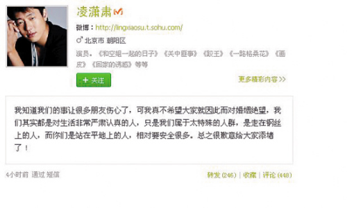 昨日,凌潇肃在微博上称,很抱歉自己的离婚给大家添堵了。“我知道我们的事让很多朋友伤心了,可我真不希望大家就因此而对婚姻绝望,我们其实都是对生活 非常严肃认真的人,只是我们属于太特殊的人群,是走在钢丝上的人,而你们是站在平地上的人,相对要安全很多。总之很歉意给大家添堵了 !”