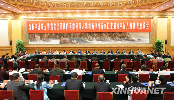 9月14日,“100位为新中国成立作出突出贡献的英雄模范人物和100位新中国成立以来感动中国人物”代表座谈会在北京举行,中共中央政治局常委李长春出席座谈会并讲话。新华社记者黄敬文摄