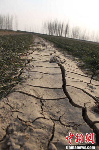 自2010年9月23日以来,山东全省除半岛以外有130多天无有效降水,全省气象干旱程度已达特大干旱等级,为60年一遇。有2899万亩冬小麦受旱,6000亩因旱已经发生死苗现象,全省约有32万人、13万头大牲畜临时饮水困难。图为山东省菏泽市成武县党集乡受旱麦田。 杨东亮 摄