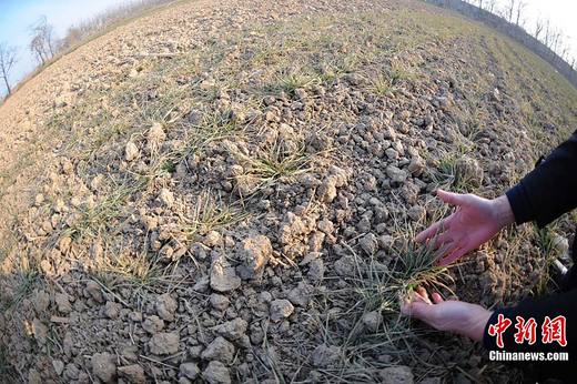 1月27日,安徽省亳州市谯城区古井镇张集村村民孙明华正在查看干枯的麦苗。最新统计显示,遭遇新中国成立以来最大旱情的安徽省淮北地区目前受旱面积达1124.2万亩。据气象部门预报,淮北地区1月底之前仍无明显降水。张延林 摄 图片来源:CNSPHOTO