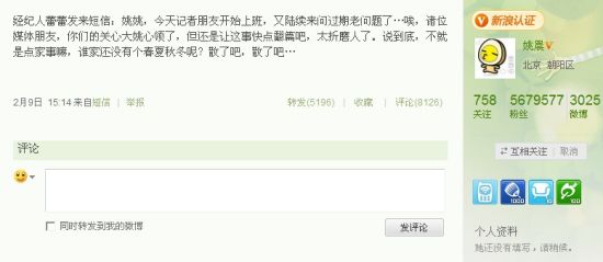 姚晨“离婚哭照”疯传 微博首次正式回应离婚