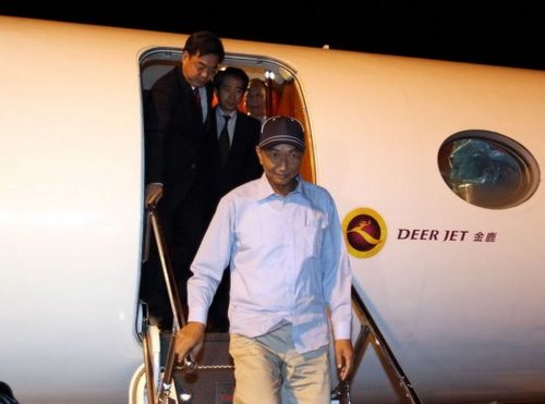 资料图:2010年9月25日,被日方非法抓扣的中国渔船船长詹其雄乘中国政府包机安全返抵福州。图为詹其雄走下飞机。