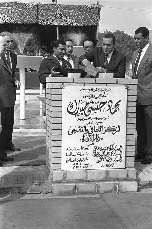 1985年3月1日,穆巴拉克(中)出席埃及歌剧院的奠基仪式。
