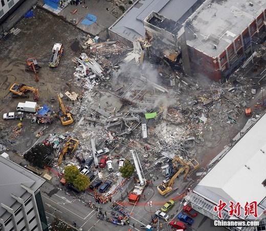 2月23日,新西兰克赖斯特彻奇市中心城区的CTV建筑废墟救援俯瞰图。