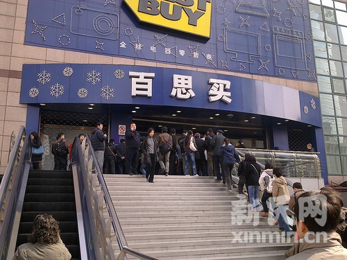 百思买门店门口挤满了人。新民网记者陶力 现场回传
