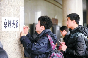 马赛比许多手足无措的考生显得淡定,那是因为他已经是第二年参加艺考了。去年,他报考了北电和中戏的导演专业却空手而归。心有不服的他,今年又卷土重来。他原计划分别报考北电和中戏的导演、文学两个专业,但为了来中戏报名,他错过了电影学院文学系的复试,可报名资料又没带齐,现在看来只有导演专业还有希望。