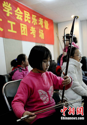 2011年2月19日,在北京煤炭文工团内孩子们在考场外抓紧时间练琴备考。当日,来自各地的学生们赶考2011中国民族管弦乐学会的音乐考级。中新社发 陆欣 摄