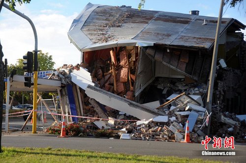 2月24日,新西兰克赖斯特彻寄(基督城)市遭受地震袭击,居民生命财产受损严重。图为地震中倒塌的建筑物。中新社发 吴志隆 摄