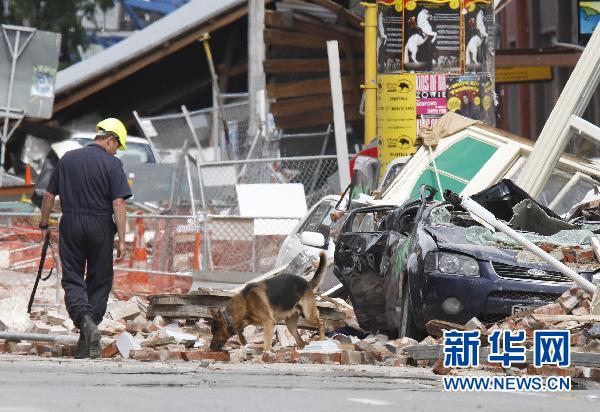 2月24日,在新西兰南岛克赖斯特彻奇,警察带着警犬在废墟中寻找幸存者。新华社/法新