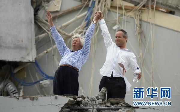 2月23日,在新西兰南岛最大城市克赖斯特彻奇,两名地震幸存者从废墟中被救出后举手欢呼。新华社/路透