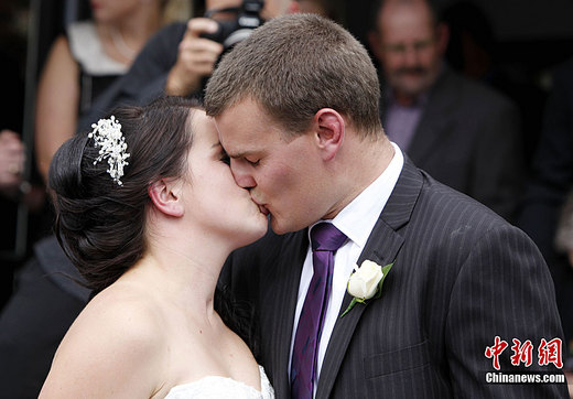 2月25日,在新西兰克赖斯特彻奇市的一家教堂外,刚刚结婚的艾玛·霍华德和克里斯·格林斯勒得在亲吻对方。在22日的6.3级地震中,艾玛所在的办公楼被夷为平地,她被埋在废墟中。获救后,她和克里斯决定举行婚礼。