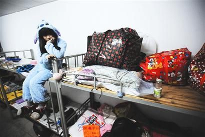图为:各地赶考,居无定所,临时寝室里都是打包的行囊