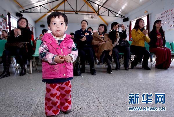 3月6日,一位“太阳村”的儿童与女委员一同观看“太阳村”孩子们的演出。新华社记者 陈建力摄