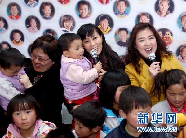 3月6日,全国政协委员严慧英(左)、张晓梅(中)和万山红在“太阳村”和孩子们联欢。新华社记者 陈建力摄
