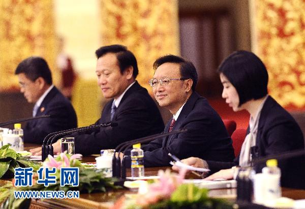 3月7日,十一届全国人大四次会议举行记者会,外交部部长杨洁篪(右二)答记者问。 新华社记者 任勇 摄