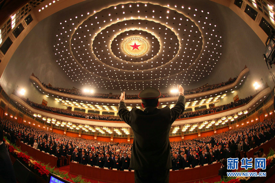 3月5日,第十一届全国人民代表大会第四次会议在北京人民大会堂开幕。图为,全体起立高唱国歌。新华社记者 兰红光摄