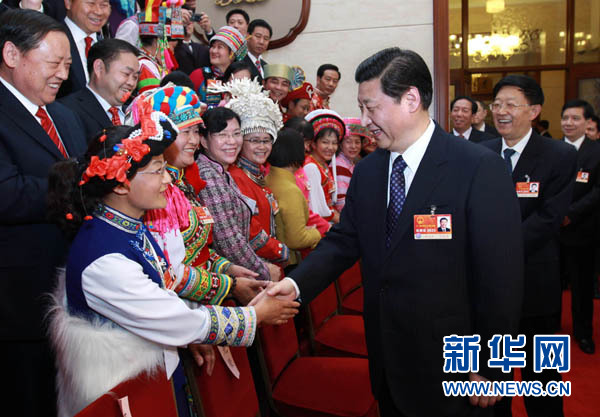 习近平参加了云南代表团审议。他十分关注盈江县10日中午发生地震后的灾情,关切地询问有关情况。习近平对灾区群众表示慰问,希望受灾地区各级党组织、领导干部和广大党员充分发挥领导核心、骨干带头和先锋模范作用,带领群众积极投身抗震救灾第一线,全力抢救受困人员,全力救治受伤群众,确保灾区群众有饭吃、有衣穿、有干净水喝,维护灾区社会稳定,全力做好抗震救灾各项工作。在听取秦光荣、沈培平、李树仙等代表发言后,习近平表示完全赞同吴邦国委员长所作的全国人大常委会工作报告。他指出,国家“十二五”规划纲要草案关于深入实施西部大开发战略的部署和要求,特别是关于把云南建成向西南开放的重要桥头堡的战略布局,为云南在“十二五”时期加快发展增添了强劲动力和广阔空间。希望云南紧紧抓住机遇,用足用好中央支持政策,以更大力度推进开放发展、协调发展和可持续发展,加快建设国际大通道,打造外向型特色优势产业大基地,构建开放型经贸合作大平台,努力使发展的基础更牢、后劲更足。同时,要紧紧抓住保障和改善民生这个重点,切实维护边疆民族地区和谐稳定,推动云南加强和创新社会管理工作再上一个新水平。习近平强调,各级党组织要把开展向杨善洲同志学习活动作为创先争优活动的重要内容,进一步形成学习先进、争当先进、赶超先进的浓厚氛围。