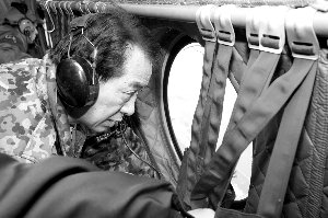 3月12日,日本首相菅直人乘飞机赴灾区视察。 新华/法新