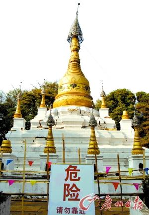 本报盈江讯 (特派记者文远竹、任朝亮)云南盈江县全国重点文物保护单位允燕塔本是一座金碧辉煌的傣式佛塔,是盈江的标志性建筑,在地震中受到严重损坏。昨日记者在现场看到,允燕塔目前已伤痕累累,成了一座不允许游客靠近的“危塔”。