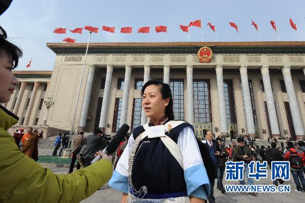 3月13日,中国人民政治协商会议第十一届全国委员会第四次会议在北京人民大会堂闭幕。这是闭幕会后,全国政协委员杨一奔在人民大会堂外接受采访。新华社记者 杨宗友摄