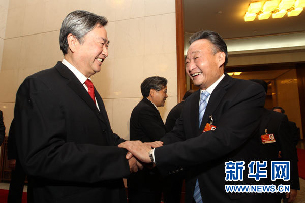 3月13日,中共中央政治局常委、全国人大常委会委员长吴邦国在北京人民大会堂看望参加两会新闻报道工作的中央新闻单位负责人。新华社记者 兰红光 摄