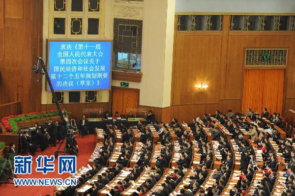 3月14日,第十一届全国人民代表大会第四次会议在北京人民大会堂举行闭幕会。这是代表们准备表决《第十一届全国人民代表大会第四次会议关于国民经济和社会发展第十二个五年规划纲要的决议(草案)》。新华社记者 谢环驰 摄