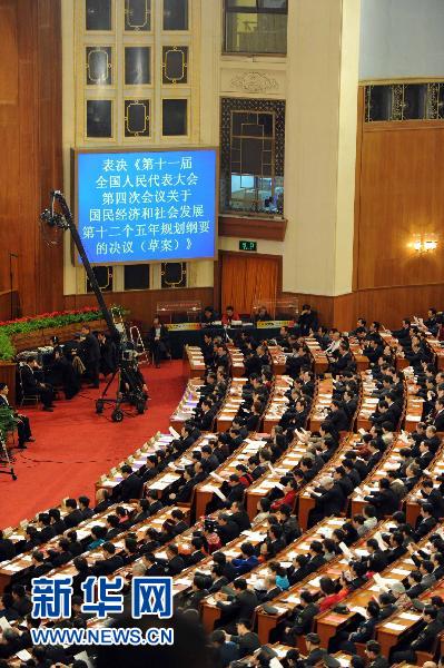 这是代表们准备表决《第十一届全国人民代表大会第四次会议关于国民经济和社会发展第十二个五年规划纲要的决议(草案)》。新华社记者 谢环驰摄