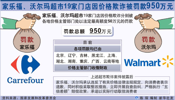 图表:家乐福、沃尔玛超市19家门店因价格欺诈被罚款950万元 新华社发