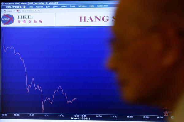 3月15日,香港,电视屏幕显示恒生指数暴跌。受日经指数下跌12.2%拖累,亚洲股市当天大幅下挫,香港恒生指数下跌3.8%,市场普遍担心日本或面临核问题威胁。