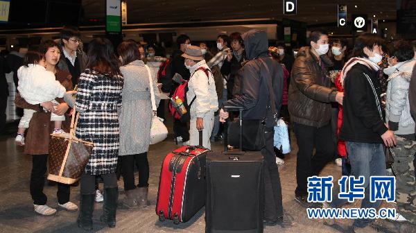 3月15日晚,等待撤离的中国公民在日本东京成田国际机场休息。来自日本地震灾区的400多名中国公民15日晚陆续抵达东京成田国际机场,准备第二天搭乘合适航班回国。 新华社记者冯武勇摄