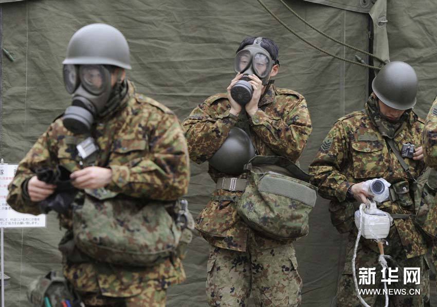 3月15日,在日本福岛县,日本自卫队成员在对核电站事故辐射影响的部分地区进行清洗前戴防毒面具。东京电力公司15日说,福岛第一核电站3号机组反应堆上方有白色蒸汽冒出,4号机组出现爆炸并发生火情。日本首相菅直人指示,居民避难半径从第一核电站周边20公里扩展至30公里。新华社/共同社