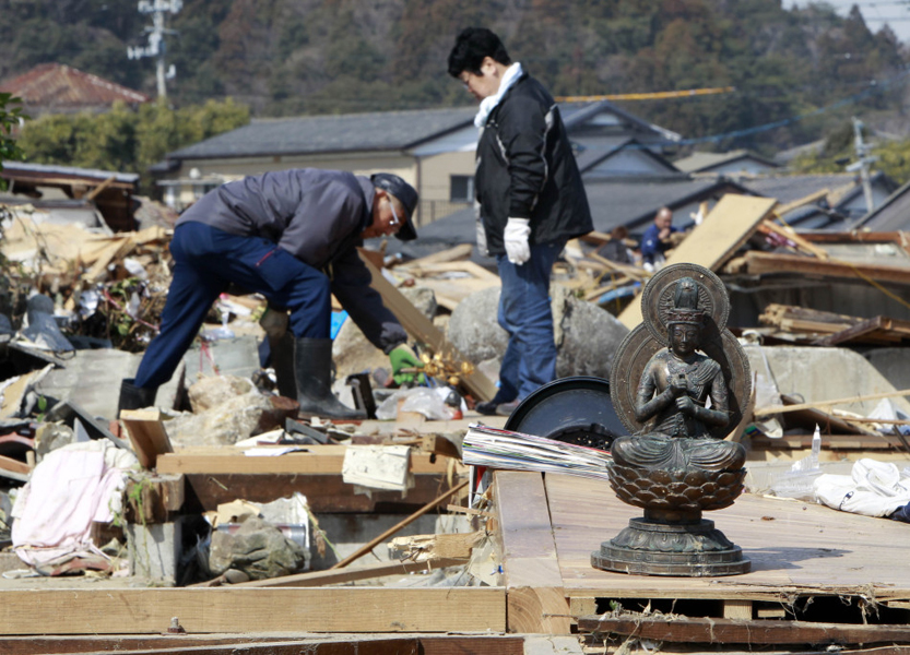 3月13日,日本东北地区地震和海啸过后,居民在自家的房屋废墟上寻找未被损坏的物品。