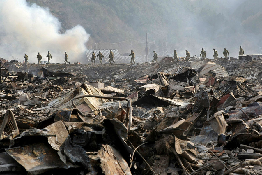 3月13日,岩手县大槌町,自卫队士兵在废墟中进行搜救。