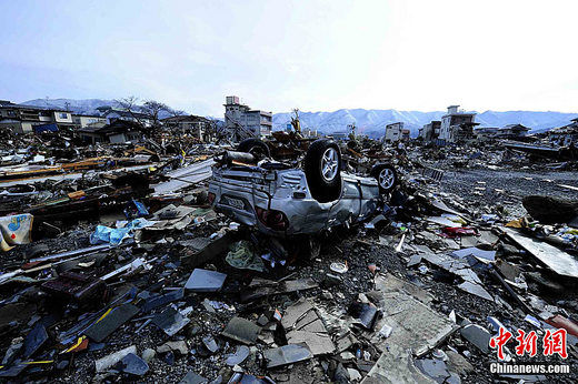 3月16日上午,日本岩手县大船渡市遭“3.11日本大地震”引发的大海啸袭击后的景象。中新社发 侯宇 摄