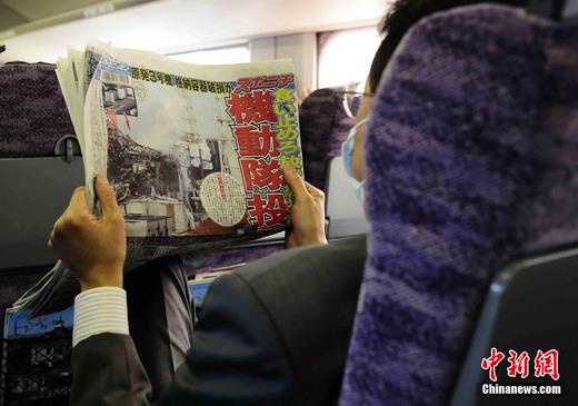 3月17日下午,在一列前往东京的新干线列车上,一名日本人在阅读关于福岛核电站三号机组最新状况的报道。中新社发 侯宇 摄