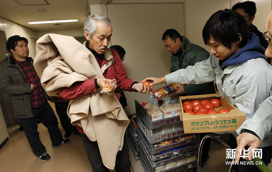 3月14日,在日本仙台的一个灾民安置点,转移至此的人们领取食品。据日本广播协会电视台14日报道,日本东北部海域11日发生的强震及其引发的海啸已确认至少造成1500多人死亡。 新华社/路透
