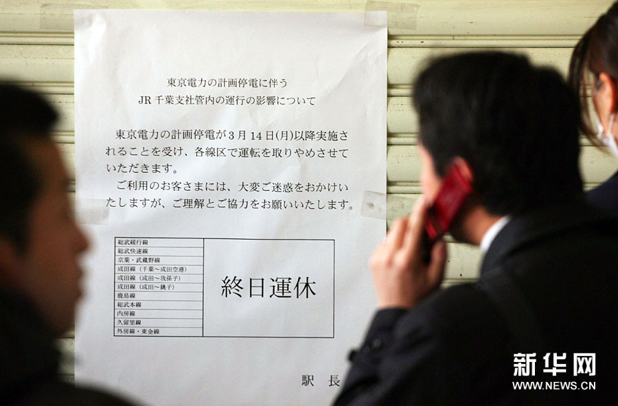 3月14日,在日本千叶县千叶市的一个车站,人们观看一个写有车站关闭的通知。 3月11日的地震导致日本交通系统发生混乱,多处港口、机场、铁路和高速公路关闭,大批人员滞留。 新华社/法新