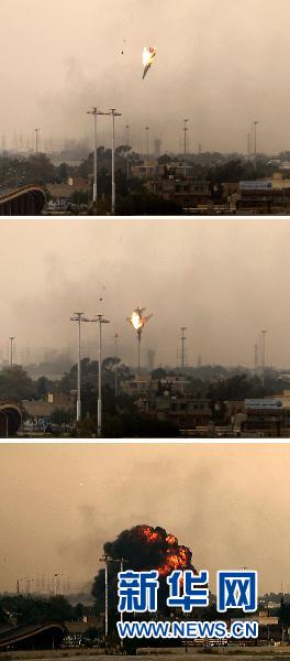 这组3月19日拍摄的拼版照片显示,一架利比亚武装部队的轰炸机在利比亚反政府武装大本营班加西城上空被击中后坠毁。 新华社/法新