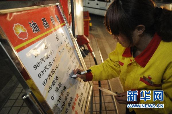 2月20日,宁夏吴忠市一家加油站的工作人员在更改油价标牌。国家发展和改革委员会19日宣布,自20日零时起将汽油、柴油价格每吨均提高350元,相当于90号汽油全国平均零售价每升上调0.26元,0号柴油全国平均每升上调0.3元,涨幅为4.5%。新华社记者王鹏摄