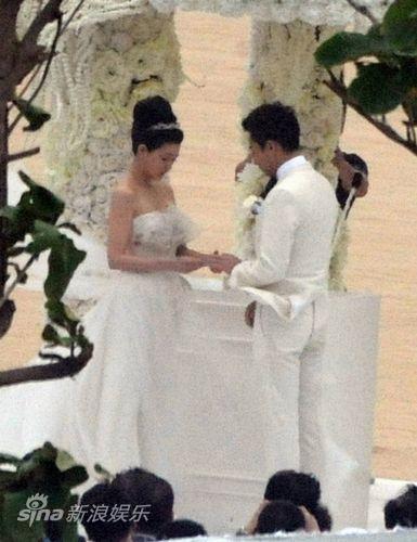 新浪娱乐讯 今日(3月22日)下午16时许,大S与汪小菲的婚礼在三亚海棠湾举行。蔡康永、小S夫妇、张惠妹、刘谦、黄晓明韩庚、李亚鹏等众明星受邀出席。图为交换戒指 。摄影/冯科 刘鸾