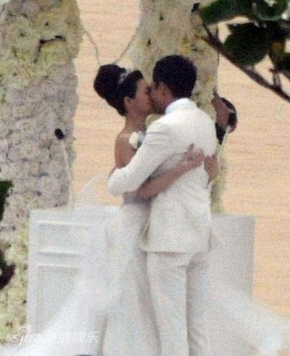 新浪娱乐讯 今日(3月22日)下午16时许,大S与汪小菲的婚礼在三亚海棠湾举行。蔡康永、小S夫妇、张惠妹、刘谦、黄晓明韩庚、李亚鹏等众明星受邀出席。图为亲吻 。摄影/冯科 刘鸾