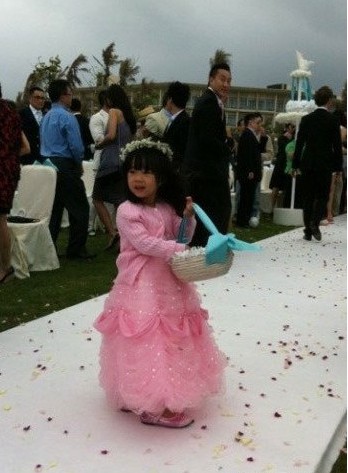 婚礼正式开始,汪小菲在小S的女儿扮成的花童下引领入场,并向亲友致意。小花童分别身穿一粉一白的礼服,小S份外激动。大S在爸爸的搀扶下走出,与汪小菲汇合。汪小菲左手牵着大S,蔡康永宣布新郎新娘入场,接受亲友祝福。图为小S翘首期盼