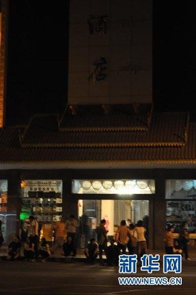 3月25日凌晨,云南景洪市一些住在宾馆的客人纷纷疏散,站在路旁。新华社发(潘宗卫 摄)