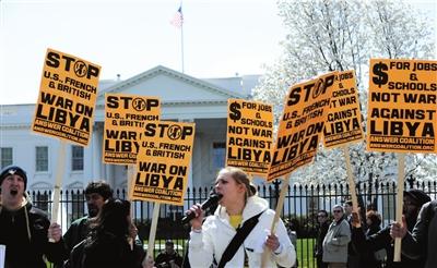 近百名示威者26日在华盛顿白宫外举行示威活动,反对美国继续参与在利比亚的军事行动,要求美军立刻停止打击利比亚。示威者高举写着“钱要拿来创造就业改善教育,不是攻打利比亚”等口号的标语牌,并在组织者的带领下高呼反战口号。