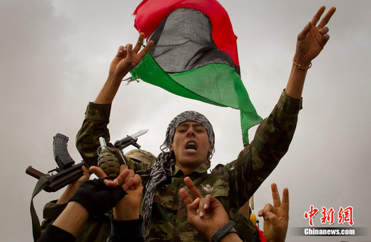 2011年3月21日,班加西市郊,反政府武装士兵庆祝胜利。