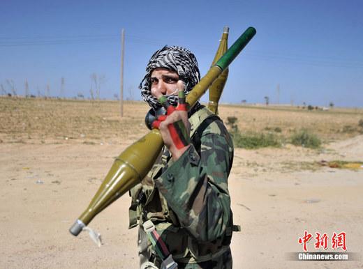 2011年3月23日,利比亚东部重镇艾季达比耶市郊,一名手持火箭弹的反政府武装士兵打出“胜利”的手势。